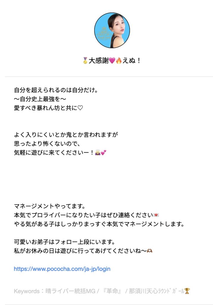 ポコチャのプロフィールには、マネージメントをやっていると書かれており、ライバー育成などもしていると捉えられる。