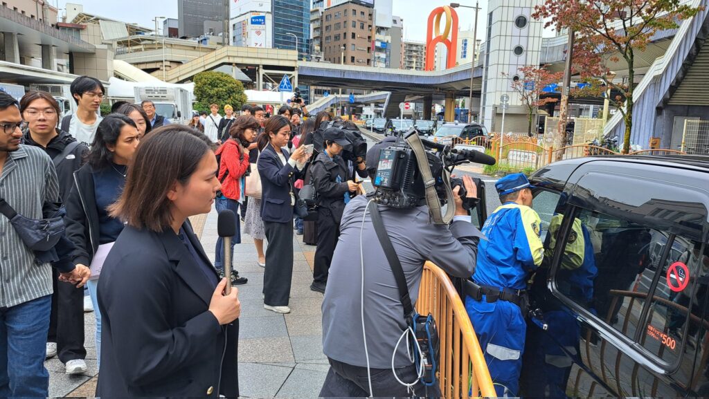 警視庁?と思われる男性がドライバーに助手席側から、話しかけている様子、報道陣が神妙な面持ちで、取材している現場が見受けられます。